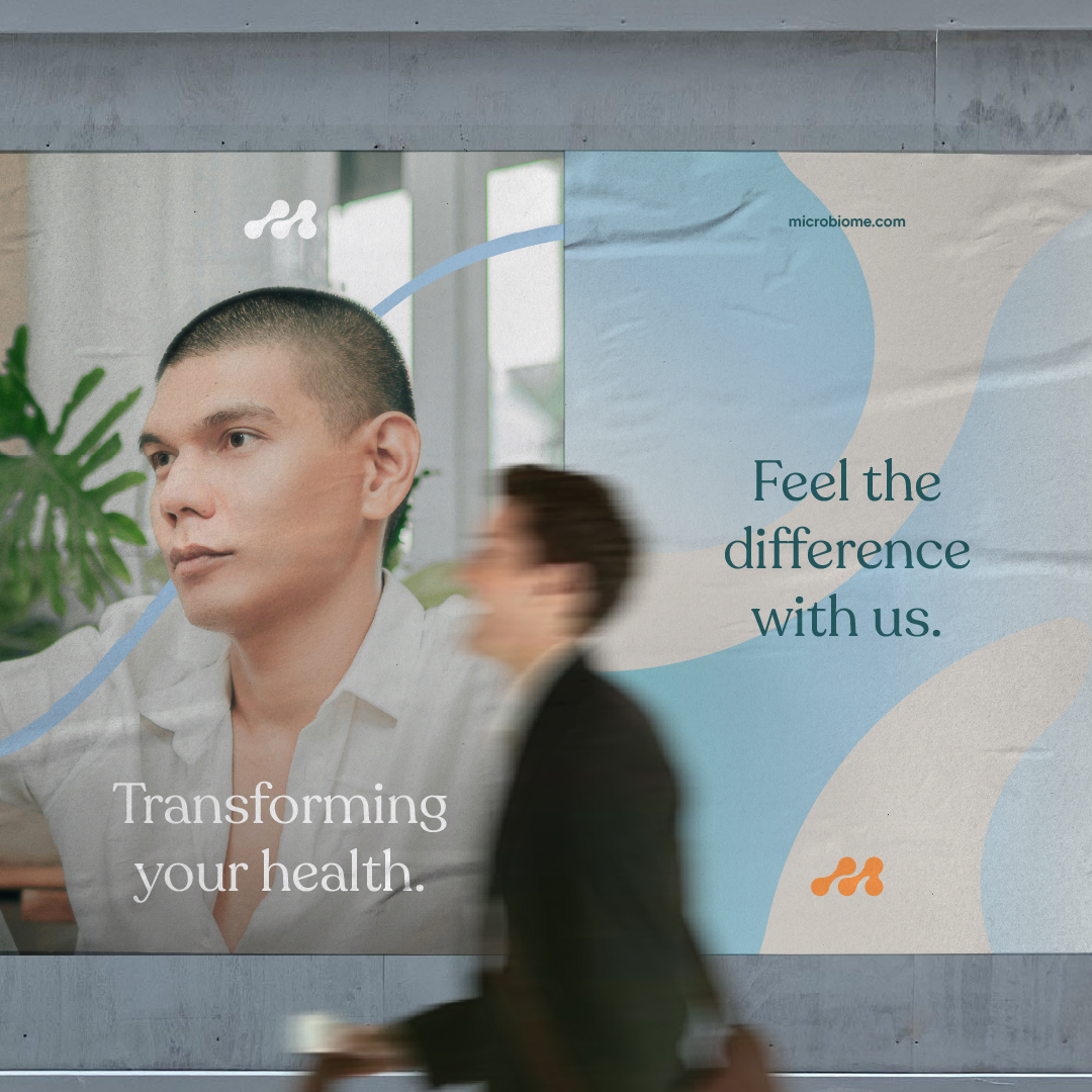 Microbiome’s visual identity centers around its custom-designed logo. The logomark, shaped like an “M” and inspired by microbes, embodies movement and innovation, while the lowercase logotype conveys approachability and reliability, enhanced by subtle organic details.