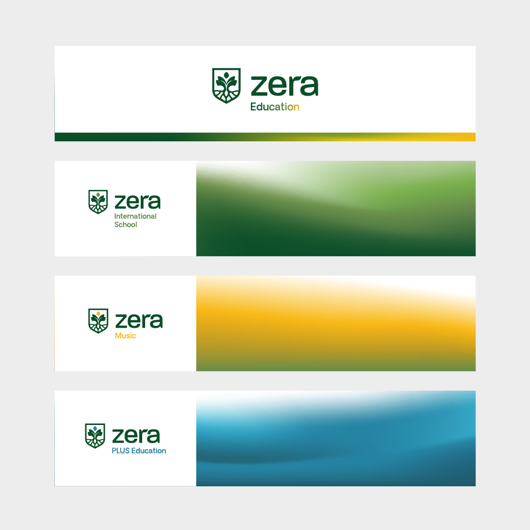 Pineapple Studio designed an adaptive logo that accommodates Zera’s three sub-brands: Zera International School, Zera Music, and Zera Plus Education. Each sub-brand owns its own unique gradient, distinguishing them while maintaining a cohesive identity.