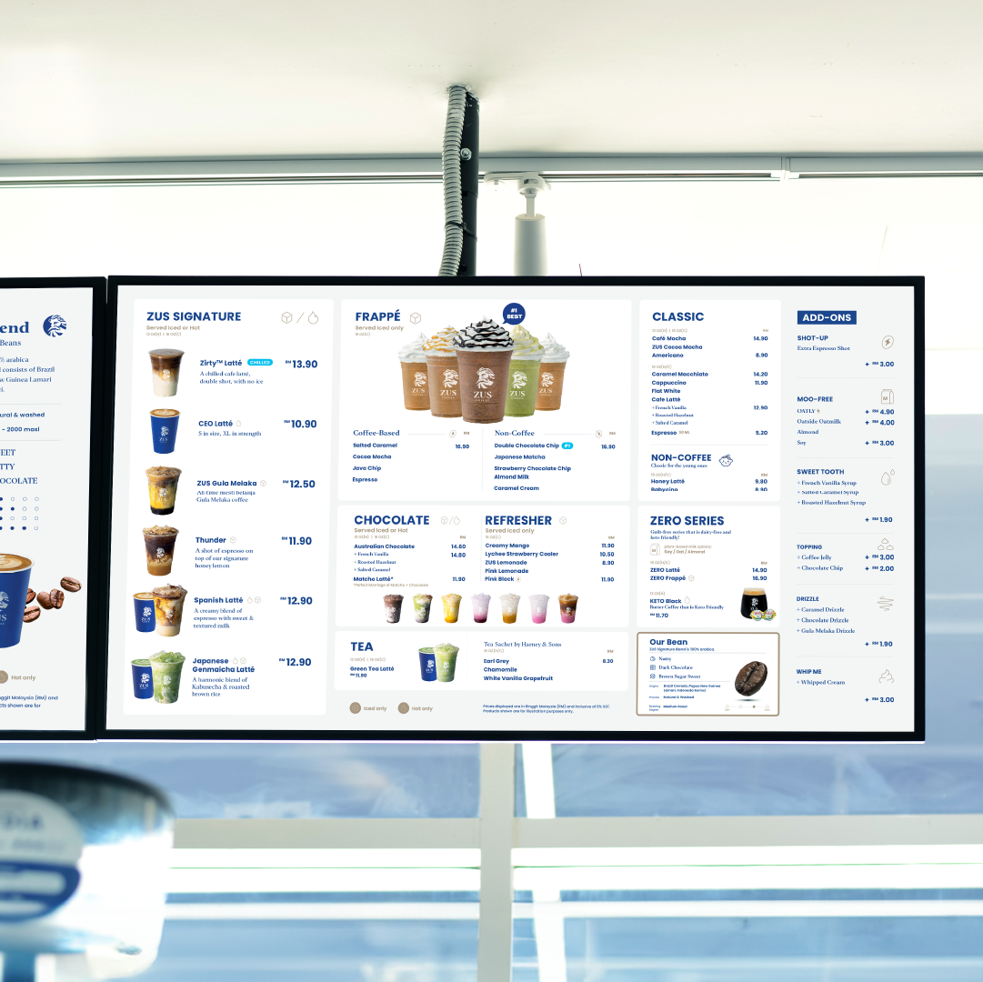 ZUS Coffee focuses on providing clean, consistent, and high-quality coffee with a seamless customer experience. Similarly, Pineapple Studio helped develop a clean, memorable logo and a consistent, cohesive brand identity – even down to selecting the perfect blue color to represent ZUS for who they are.